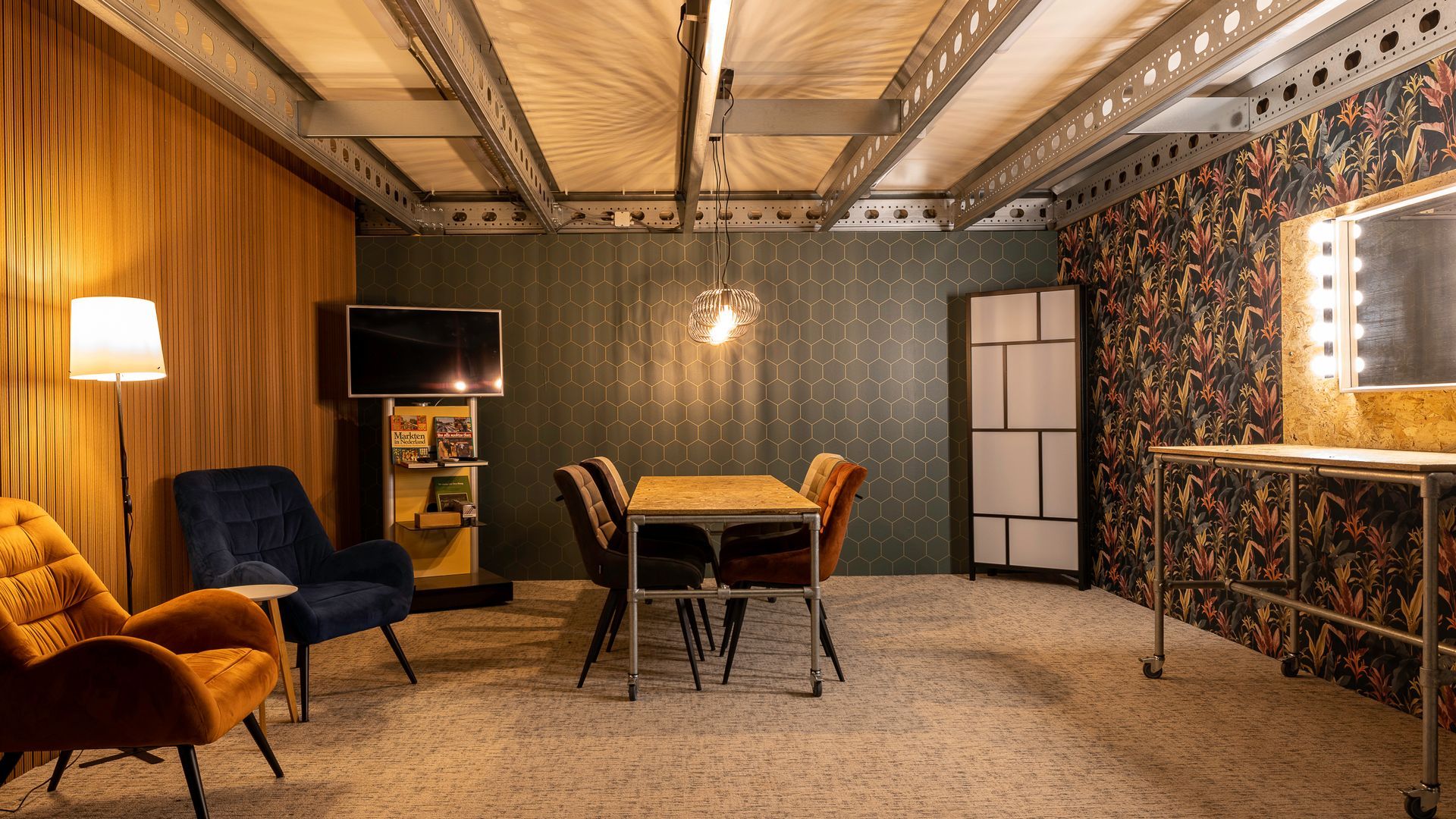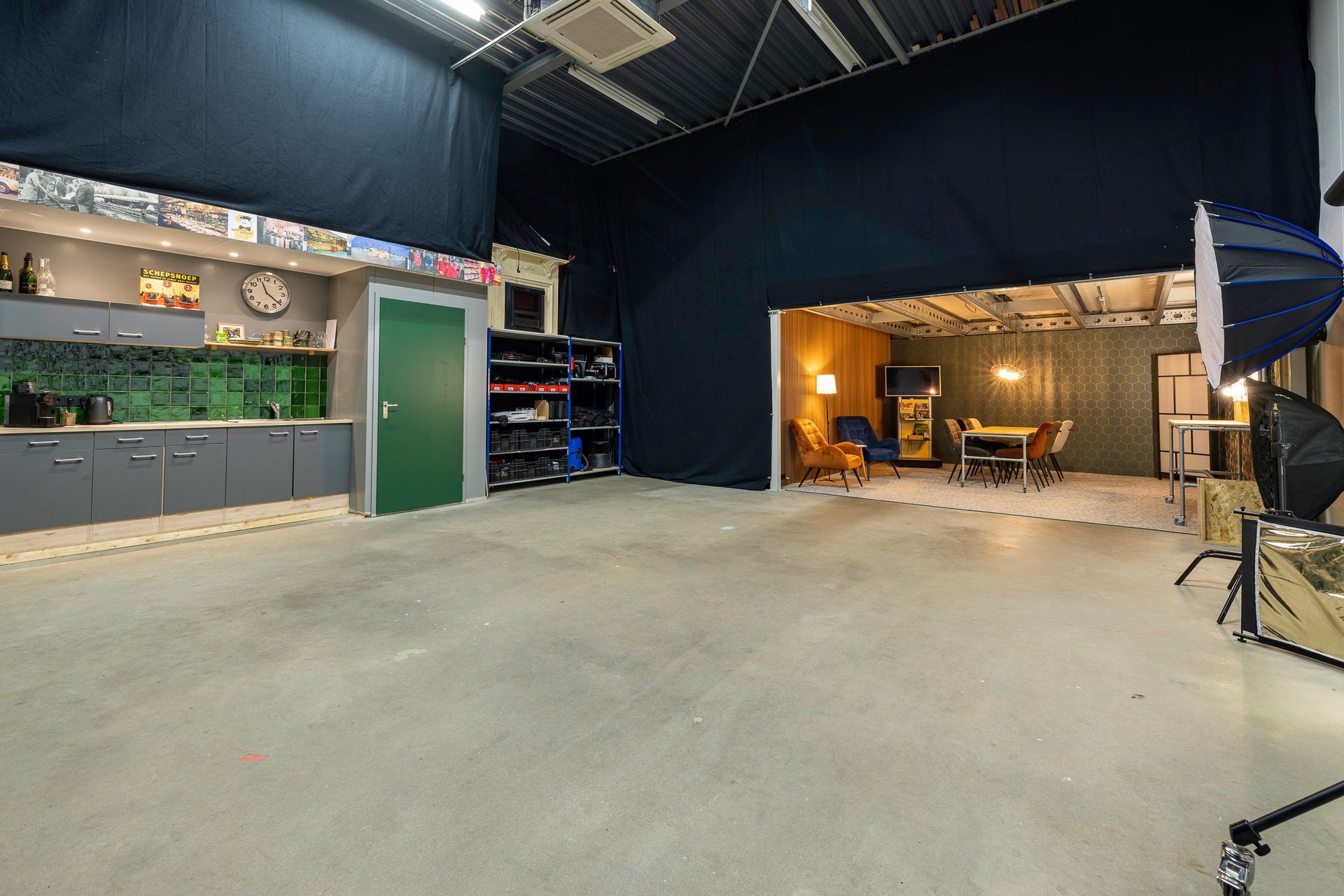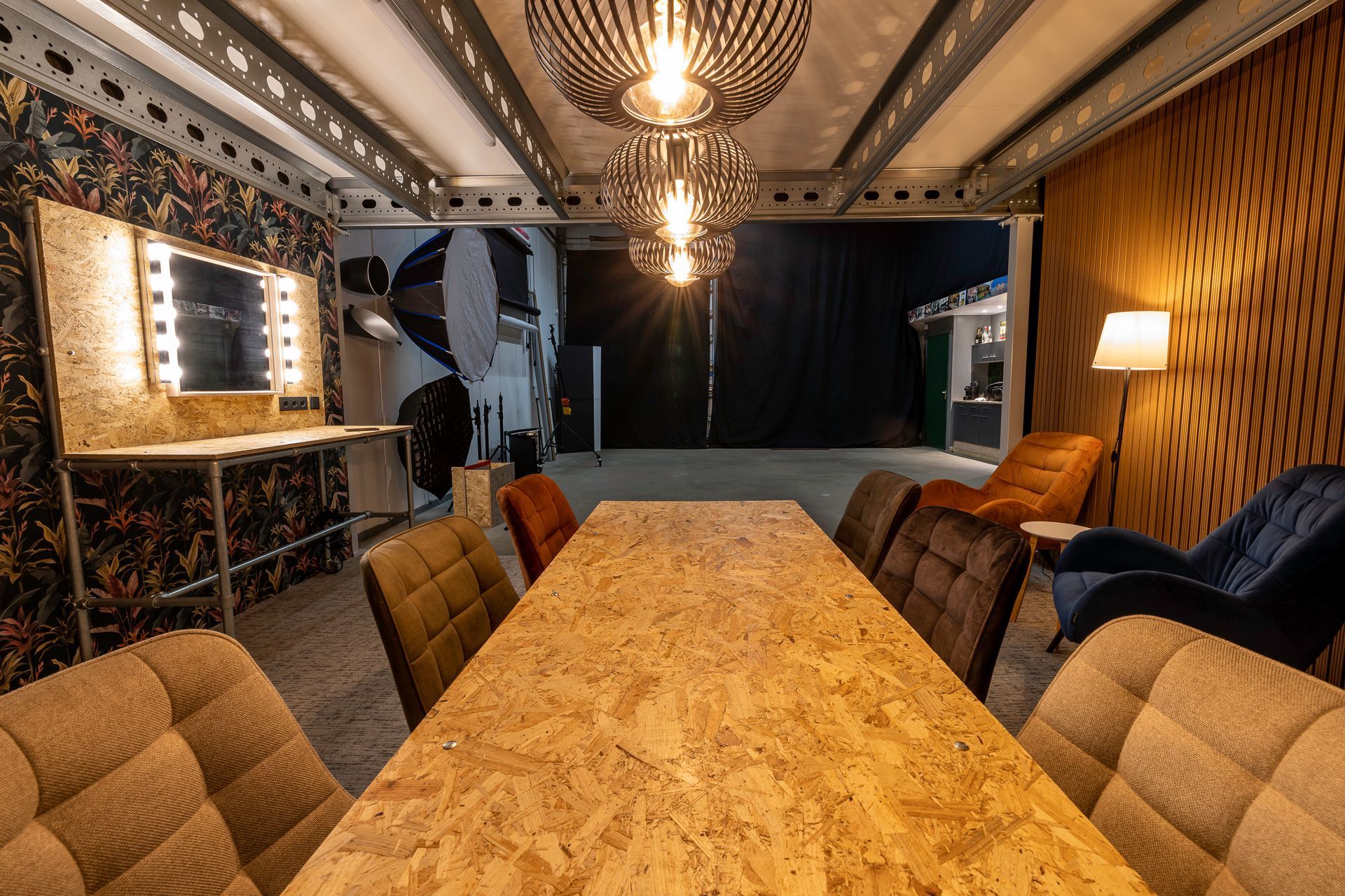 - Visagie/ontspan ruimte (25 m2) met lekkere stoelen en grote tafel