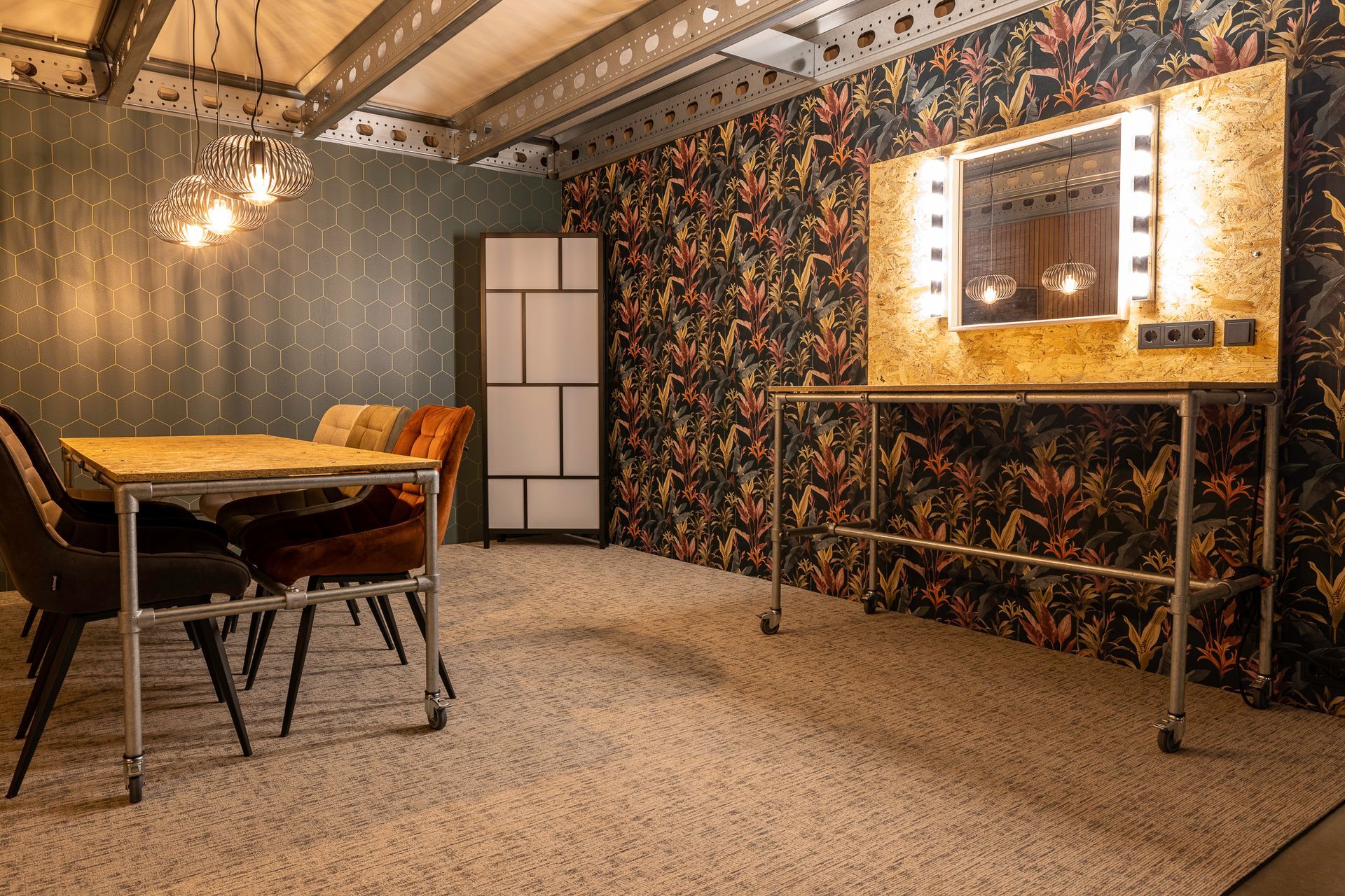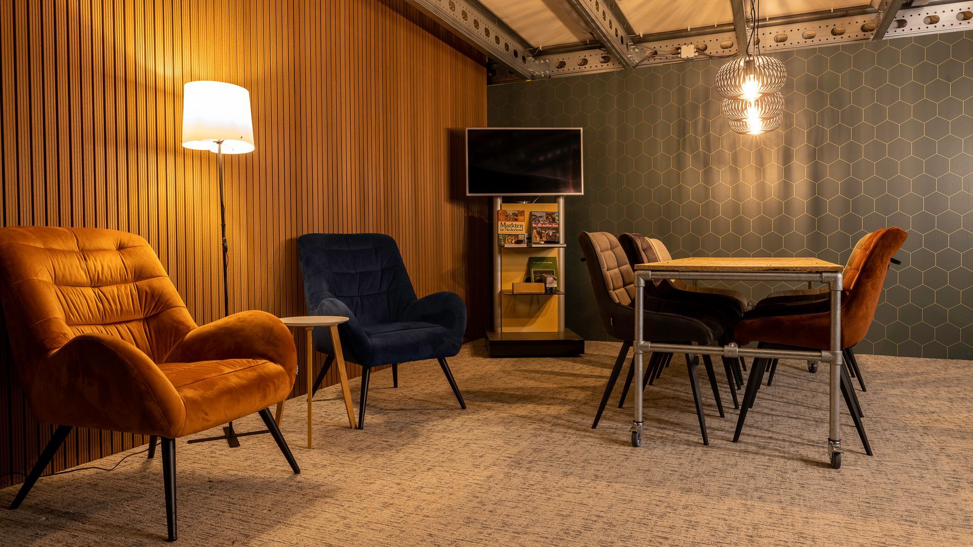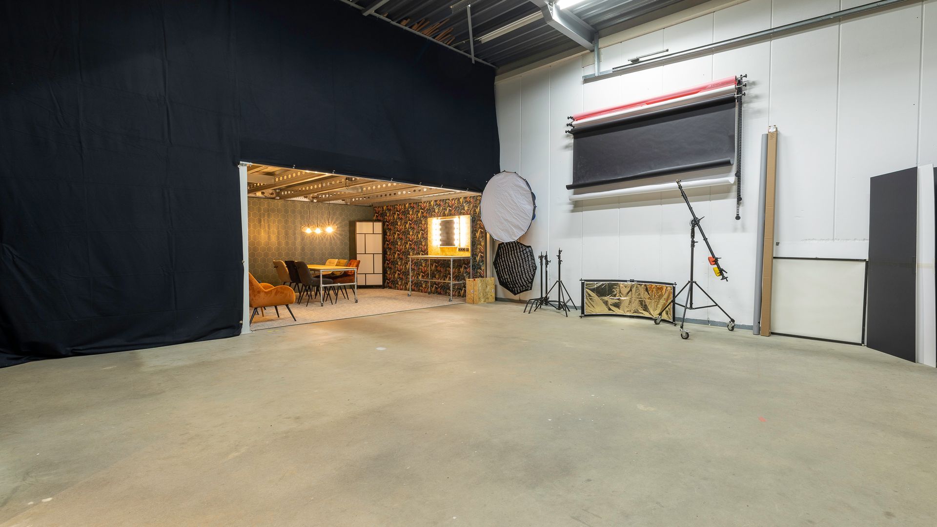 - Visagie/ontspan ruimte (25 m2) met lekkere stoelen en grote tafel